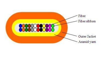 Platteband optische kabel 4-24 kernen met φ250μm kleurenvezel als optisch communicatiemedium. De kleurvezels zijn omwikkeld met een laag aramidegaren als krachtversterkende eenheid, die is gecoat met een mantel van polyvinylchloride (PVC) of rookarm halogeenvrij materiaal (LSZH).